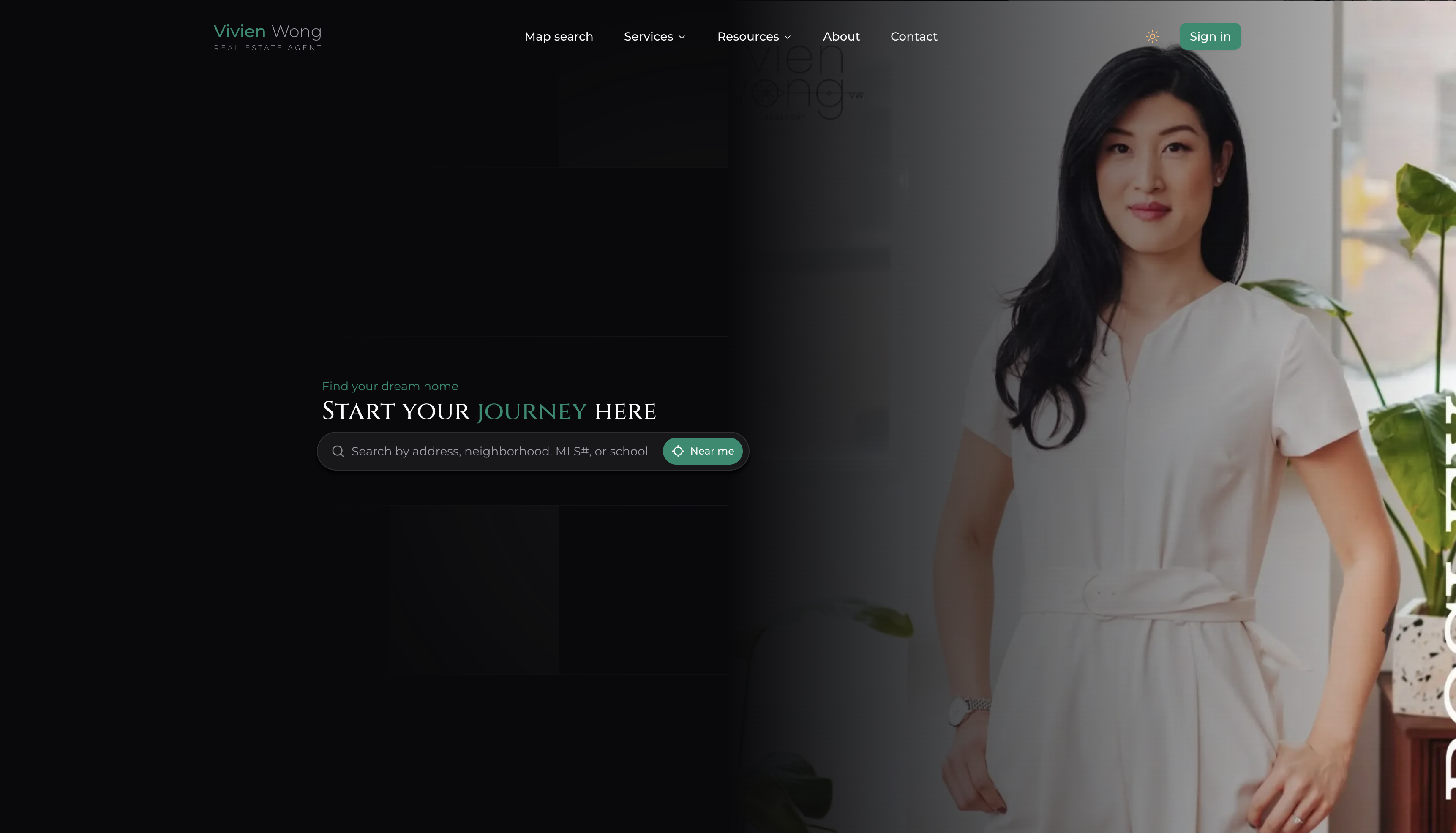 The dark mode variant of Vivien, offering a bold, dramatic look for premium listings.